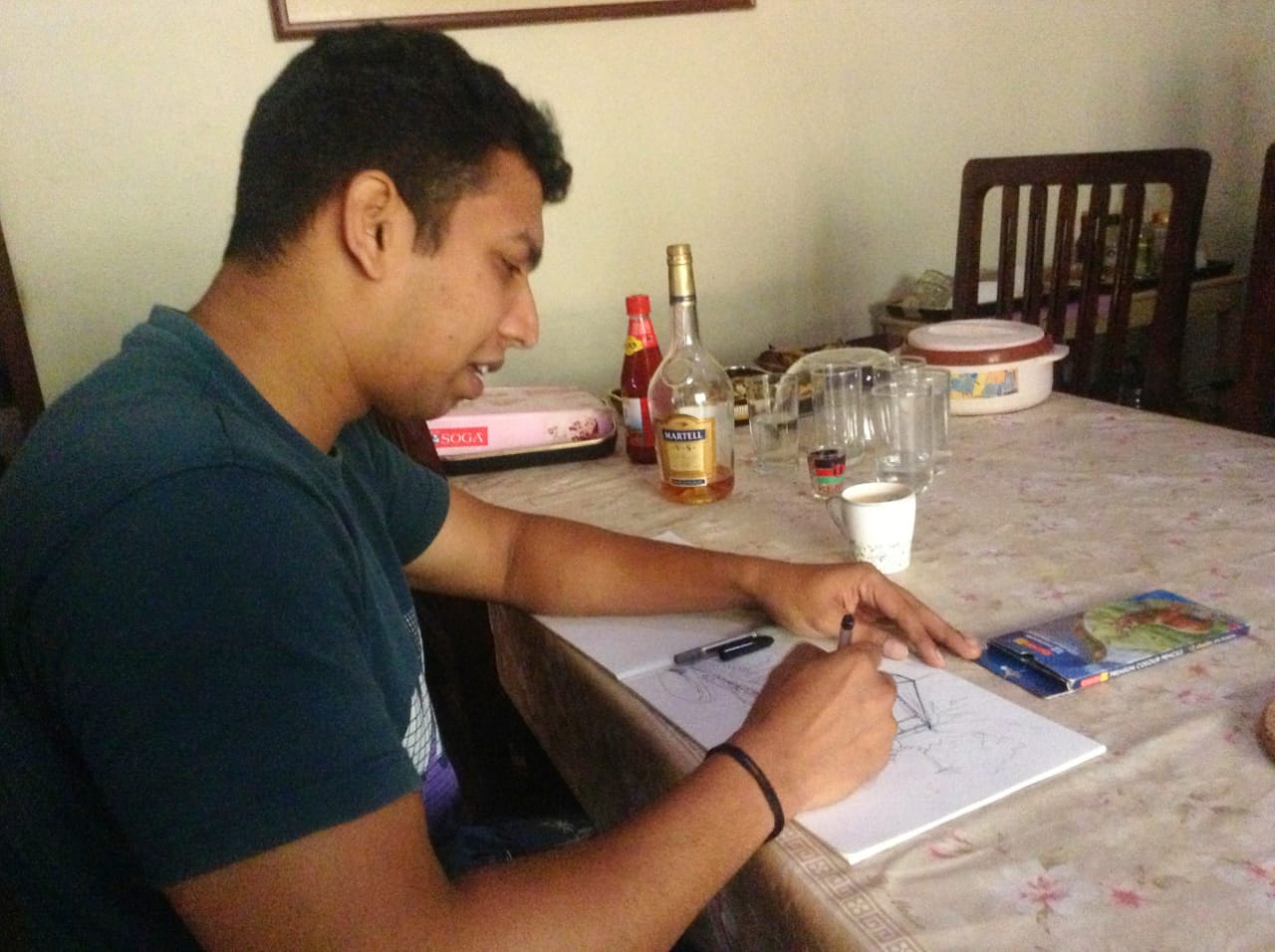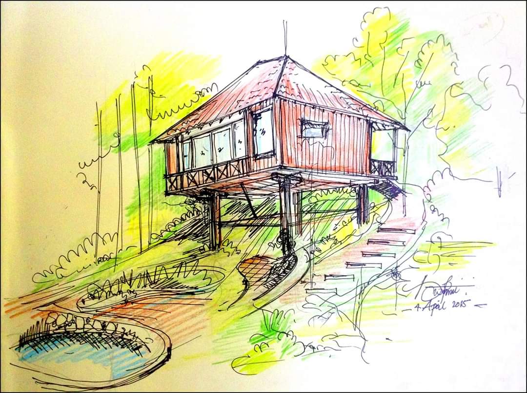 So, needless to say, there was no dearth for ideas and the ideas were literally spilling out of the (wooden) box! But the final form could not be fully decided. We needed an architect to give it a form. Faaez suggested his college mate Divin who had already started his practice in Calicut. He was immediately commandeered by Jyothi, and he graciously flew to our spot in Coorg at short notice, despite his busy schedule. We were thrilled to have him on board to help us visualize the final design on paper! We salute his affable nature in responding positively to our wild imaginations however absurd it sometimes looked. He stayed a couple of days to produce a beautiful sketch of our dream cabin in all its glory. He even graced us with his advice and suggestions regarding the latest materials and construction practices which we could effectively employ to our total satisfaction.